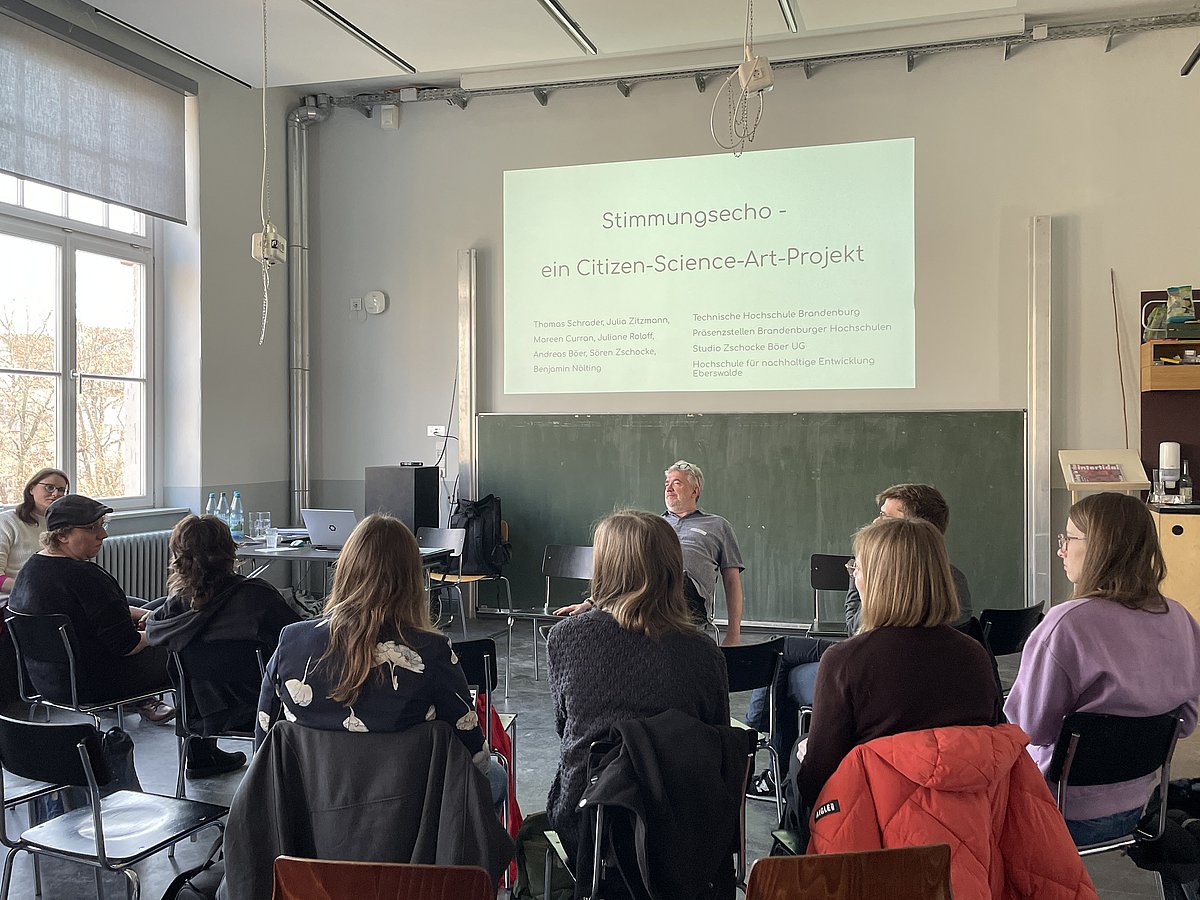 Im Rahmen der Tagung präsentierten sie das Experiment „StimmungsEcho“. Dabei werden mithilfe von Eingabemedien an mehreren Orten Stimmungen erhoben und künstlerisch visualisiert, sodass ein unmittelbares Echo auf die kollektive Gemütslage in Echtzeit entsteht. Dieses niedrigschwellige Beteiligungsformat schafft Anlässe für Gespräche und Austausch zwischen Bürgerinnen, Wissenschaftlerinnen und regionalen Akteurinnen und Akteuren.