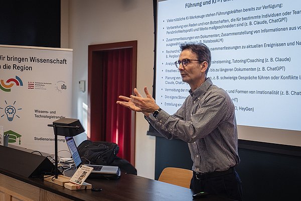 Beim Transferfrühstück am 5. November im KreativWerkR6 in Hennigsdorf drehte sich alles um die Frage, wie sich Führung in Zeiten des technologischen und gesellschaftlichen Wandels verändert. Rund 20 Teilnehmende – überwiegend Führungskräfte aus der Region – kamen mit Prof. Dr. Eric Kearney von der Universität Potsdam in den Austausch.